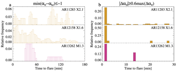We further examined the temporal distribution of two other proxies, min(αlf-αhf) and Δαlf. Because the first of these is generally related to short-lived brightenings in reconnection-indicative morphologies, it can be an indicator of small-scale magnetic reconnection. If unrelated to flares, such events should occur stochastically (Figure 3a, top). Instead, in several cases, they cluster before flare onset, forming distinct peaks at about 30-90 minutes before flares (Figure 3a, bottom) or the occurrence intensifies at a certain time before flares (Figure 3a, middle). In Figure 3(b), instances when Δαlf exceeds a threshold form a peak near the flare onset, often within the last few minutes. These behaviours were derived from the analysis of 14 flare events. If confirmed in a larger flare sample, these variations may serve as quantitative precursors of flare activity.