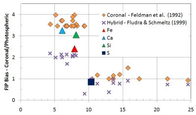 Figure 5: FIP bias vs. FIP for two different models of coronal abundances used by CHIANTI and for the XRS-measured values for Fe, Ca, Si, and S averaged over five ~M-class flares.