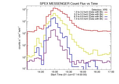 The largest flare seen by MESSENGER since its launch occurred on 1 June 2007. The XRS light curves are shown for four energy bands in Fig. 2. Note that XRS accumulates spectra for 5 minute intervals. This is a limitation for the more impulsive flares in hard X-rays but for the thermal component below 10 keV, this is not such a serious problem although, of course, a higher cadence would have been preferred.