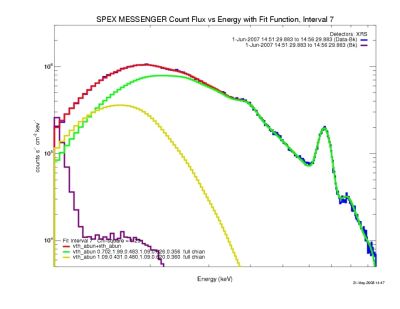 Figure 3: MESSENGER XRS spectrum with CHIANTI thermal best-fits. Blue histogram: background-subtracted X-ray count-rate spectrum measured with XRS at the time of peak temperature during the flare starting at 14:30 UT on 1 June 2007. Green and yellow curves: CHIANTI-predicted line-plus-continuum thermal spectra that when summed (red curve) give the best fit to the data. Purple histogram: pre-flare backgound spectrum.