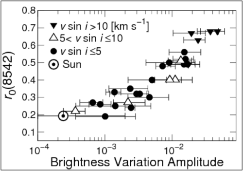 3. Based on solar observations, it is known that if there are large dark starspots on a stellar surface, the "core depth" (the depth and width of a spectral line) of the Ca II 854.2 nm (once-ionized calcium) absorption line becomes shallow (Figure 3). We investigated the core depth of this line, and found there to be a correlation between the amplitude of the brightness variation of the star and the intensity of its line (Figure 4). All the targets expected to have large starspots because of their large amplitude of the brightness variation show high chromospheric activities compared with the Sun.
