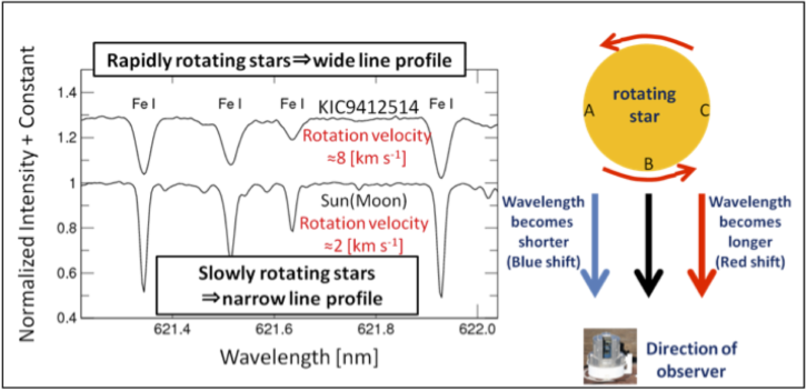 2. On the basis of the Kepler data, superflare stars show somewhat regular, periodic changes in their brightnesses. The typical periods range from one day to a few tens of days. Such variations can be explained by the rotation of a star with large starspots. As shown in Figure 1, the stars would become dimmer when their starspots are on their visible sides. Moreover, the timescales of the brightness variations should reflect the stars' rotation speeds. Spectroscopic observations allow observers to estimate the rotation velocity from the broadening of absorption lines (Figure 2), and we confirm that such spectroscopic velocities match the brightness-variation timescales. Note that the measured rotation velocity of some of the target superflare stars is as slow as that of the Sun, about 2 km/s at the equator..