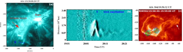 The wave did not expand symmetrically in all directions, instead propagating mainly toward the east limb through the arcade loops. The wave chose the path of high density loops, most likely because of lower Alfvén speed. The fast EUV wave triggered the kink oscillation of the arcade loops during its passage through them (Figure 2 (a)). A decaying sine-function fit to the oscillation profile provide the period and decay time, 210 s and 506 s, respectively (Figure 2(b)). The estimated phase speed was ~1140 km/s. The Alfvén speed was thus ~840 km/s, almost consistent with the observed wave speed during its passage through the arcade loops.