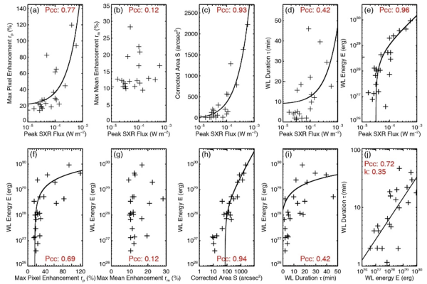 We identified 48 WLFs at 360 nm from 89 M- and X-class flares in NOAA 13664/13697, with an occurrence rate of 54%. This occurrence rate is much higher than that (24%) in our long-term-continuous sample from October 2022 to May 2023 with WST data (Ref. [1]), in which 49 WLFs at 360 nm are identified from 205 M- and X-class flares. Note that the observing wavelength (360 nm) is a novel capability of the ASO-S observatory, and that most previous WLF observations have been at longer wavelengths. The main reason is that the two SARs have a relatively higher proportion of the X-class flares (19.1% vs. 3.4%), as the occurrence rate rises with flare magnitude. We further investigate the relationship between the WLF occurrence rate and sunspot number from October 2022 and June 2024, as shown in Figure 1. The WLF occurrence rate shows a similar fluctuating increasing trend as the sunspot number, with a Pearson correlation coefficient (Pcc) of 0.64 between them.