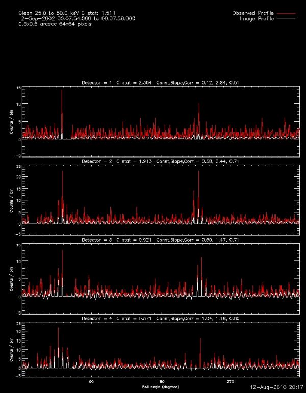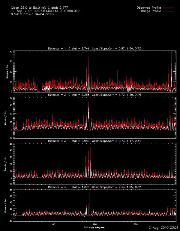 The profiles for both images show a bad fit for detectors 1 and 2. The C statistic in each case is over 2.0. This may be a result of the inability of the finer grids to image a source which is extended due to the albedo contribution, but I'm not sure. For detectors 3 and 4 the fits for the image at disk center are good, they each have a C statistic below 1. For the image near the limb the C statistics are above 1. This implies that when the extended albedo source is displaced from the point source detectors 3 and 4 still have trouble imaging both sources while for a source at the center they can create a good image. The caveat to this conclusion is the pointsource and albedo at the center has 1/3 as many total counts as the one on the limb, so this may be a function of bad statistics.