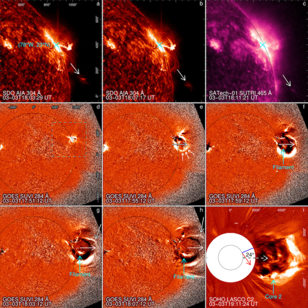 Furthermore, the study found that the motion direction of a major portion of the filament lagged behind the transition of the overall CME structure in the March 3 event. This resulted in the filament being displaced to the southern part of the CME, moving away from the ecliptic plane (as indicated by the arrow in Figure 1(i)). This highlights the complexity of CME features; for instance, in situ observations near the ecliptic plane might not detect the filament material.