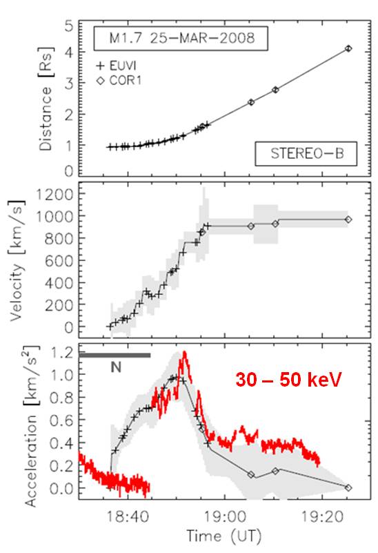 imported>Bdennis (uploaded a new version of "File:Temmeretal2010.jpg": CME kinematics of the 2008 March 25 M1.7 flare/CME event. Top to bottom: CME distance, velocity, and acceleration against time together with the background-subtracted flare HXR flux (red, ) |