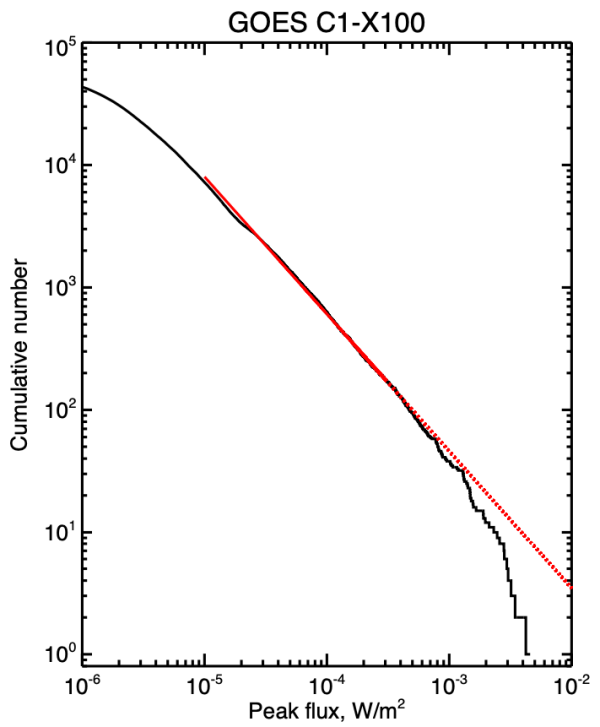 Figure 2: Cumulative occurrence distribution function for GOES peak fluxes, as reinterpreted in Ref. [2]. The red line shows a least-squares fit to the range M1-X3, extrapolated towards the "superflare" neighborhood. Note that these magnitude estimates include the 12 saturated events now consistently corrected for saturation.