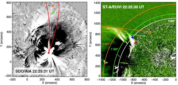 EUV wave: as can be seen in Figure 1 the identified EUV wave signatures from SDO/AIA (green and orange dots indicate the the peak and leading front of the wave) do not match those identified from STEREO-A/EUVI (blue and red crosses mark the wave front at the solar limb and at a height of about 90 Mm). Following the reconstructed LOS for the EUV wave positions of SDO (indicated by the lines in the corresponding colors in the upper right panel of Fig.1) discovers why. The signatures observed on-disk in SDO/AIA contain contributions from the expanding CME front higher up in the corona. This significiantly influences the speed measurements of the wave. From STEREO-A’s view the resulting speed of the wave is much lower (v ~ 525km/s) compared to the LOS result obtained from SDO (v ~ 1000km/s).