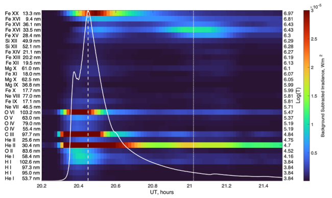 The late phase of a solar flare represents a second significant peak in warm coronal emissions (e.g., Fe XVI 33.5 nm and Fe XV 28.4 nm), reflecting substantially delayed loop energization. It is clearly distinguished from the hot gradual phase directly following the impulsive phase Figure 1 shows an example of an X-class solar flare (SOL2011-11-03) which exhibited a pronounced late phase. Figure 1 illustrates the emission variations relative to background values for 31 solar spectrum lines measured by SDO/EVE during different phases of the X2.9 flare. The maximum X-ray flux in the 0.1 - 0.8 nm range was reached at 20:27 UT, as indicated by the vertical dashed line. The solid white line represents the normalised X-ray flux. Two peaks in warm coronal emissions (Fe XVI 33.5 nm and Fe XV 28.4 nm) are clearly visible. The first peak (~20:29 UT) is associated with plasma cooling after the maximum of the hot X-ray flux, while the second, stronger peak corresponds to the EUV late phase of the flare. The maximum emission flux of Fe XVI 33.5 nm occurred at approximately 21:01 UT, marked by the vertical dotted line.