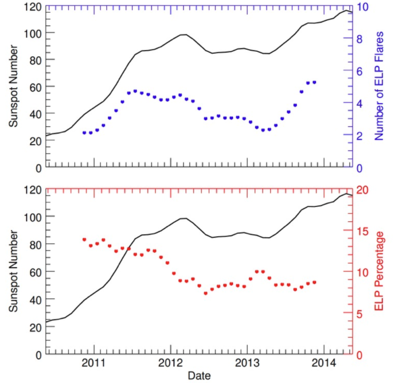 We have investigated (Ref. [4]) all 1803 flares with a GOES soft X-ray class at C3.0 and above between May 2010 and May 2014, identifying 179 EUV late-phase flares (roughly 10%). The number of EUV late-phase flares correlates well with the solar cycle. The percentage of flares characterized as EUV late phase flares, on the other hand, shows a strong negative correlation with the sunspot number (Figure 1).