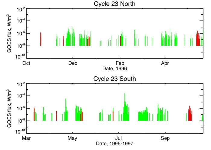 To learn whether the new cycle is starting properly (from RHESSI's point of view, as a flare mission, "properly" means having some nice solar flares to study), we compare with the previous cycle onset. The previous solar minimum appeared at different epochs in the two hemispheres (ref. [1]), so we have taken each of these epochs and plotted the GOES flare events in the current rise phase relative to those epochs. The results are in Figure 3. The epochs (March 1996 and October 1996 differed by seven months, and the time range overplotted is seven months and 21 days between Dec. 1 2008 and the time of writing. The flares of the current epoch are in red, and the flares of the two earlier epochs are in green. Clearly the burst of activity around July 4th is as it should be, but equally clearly there is a vast difference between the flare occurrences in either of these epochs. This is presumably consistent with the lack of spot activity and so it was expected, but in terms of flare occurrence (the "cracking of the whip" of solar activity?) the differences are striking.