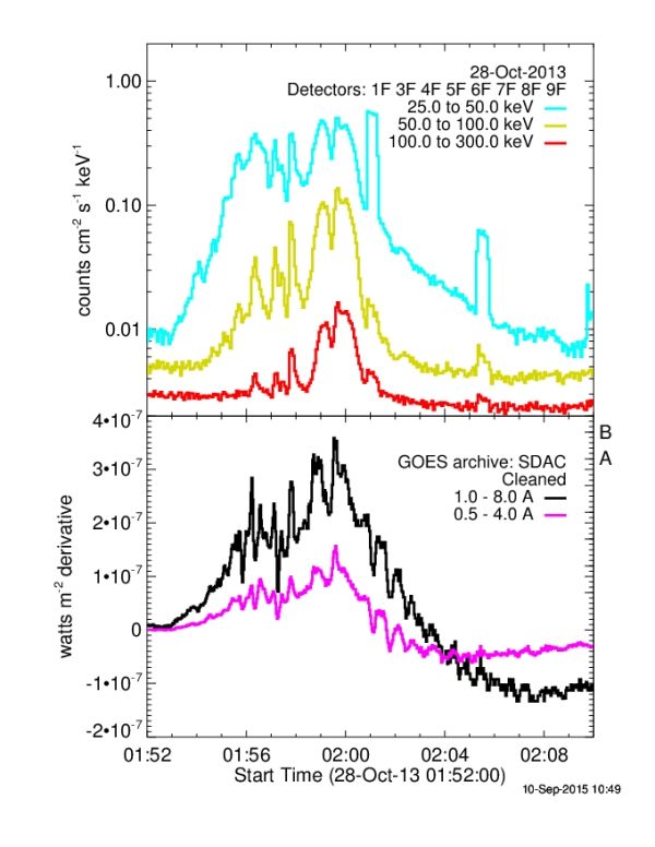 Figure 2: RHESSI 25 to 300 keV and GOES time derivative light curves for the flare starting at 01:52 UT on 23 October 2013 (SOL2013-10-23)