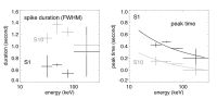 Figure 2: temporal properties of two example hard X-ray spikes. Left: duration of spikes at different energies. Right: energy-dependent spike peak times (symbol) fitted to the time-of-flight plot (lines).