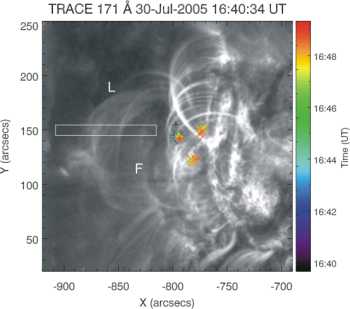 Figure 1 TRACE 171 Å image prior to a GOES C8.9 flare, overlaid with centroid positions of the HXR looptop emission (in a '+' symbol) and of the HXR footpoints (in a 'x' symbol), observed by RHESSI during the flare. The time evolution of the centroid positions is color-coded, and the positions are differentially rotated to 2005 July 30 16:40:34 UT, the time when the TRACE image was taken. A collection of coronal loops, which first contracted, then expanded, and erupted during the flare, is labeled 'L'. A filament appearing in absorption is labeled 'F', which became in emission and erupted with the coronal loops during their expansion phase. A horizontal slit is placed across the group of coronal loops to study their contraction.