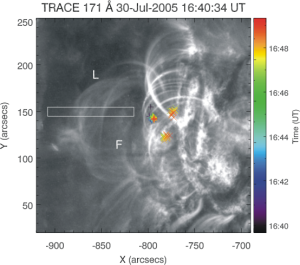 Figure 1 TRACE 171 Å image prior to a GOES C8.9 flare, overlaid with centroid positions of the HXR looptop emission (in a '+' symbol) and of the HXR footpoints (in a 'x' symbol), observed by RHESSI during the flare. The time evolution of the centroid positions is color-coded, and the positions are differentially rotated to 2005 July 30 16:40:34 UT, the time when the TRACE image was taken. A horizontal slit is placed across the group of coronal loops of interest (labeled 'L') to study their contraction. Underneath, a filament appearing in absorption is labeled 'F'.