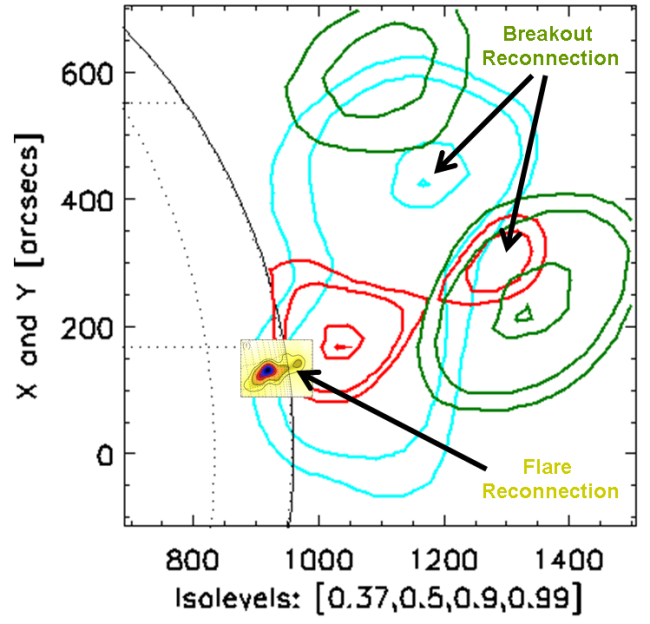 Strong evidence for breakout reconnection has recently been identified in the combined meter-wave radio and RHESSI X-ray observations of a well-observed SEE (Aurass et al. 2013). Figure 1 shows the dynamic radio spectrum (AIP) and the RHESSI 150-300 keV flux curve. The onset of strong particle acceleration is indicated by a light-brown box in Figure 1, and the radio spectrum is enlarged and contrast-enhanced in Figure 2. It depicts the dynamic spectrum of a seemingly minute feature (the black arrow points to it) shown spatially resolved in Figure 3. Several radio sources appear instead the previous faint one above the active region: we show the radio images at two frequencies (Nançay Multifrequency Radioheliograph, NRH, courtesy: The Radioheliograph Group), as well as the RHESSI hard X-ray image.