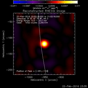 RHESSI's detectors accumulate radiation damage, and require periodic re-annealing. This involves bringing the temperatures up to a certain point, whereupon the crystal defects that have built up will tend to heal themselves. Then a careful cool-down to the normal operating temperature restores the pre-anneal performance. At least that is the hope, but it is a delicate operation and surprises have happened in past episodes. We have previously annealed in 2007, 2010, 2012, and 2014, and maintain a table here that lists not only the anneal time intervals, but also the times of offpoint from the Sun. These are all of the major data gaps in our solar coverage. The present one started on February 23, and will last probably until mid-April. Figure 1 shows the last flare imaged in the current series (see this Browser summary): SOL2012-02-22T20:55 (B8.7).