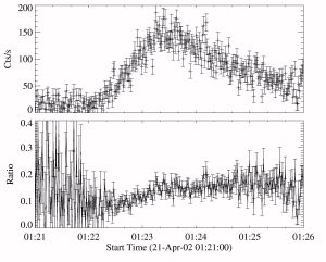 The 2002 April 21 flare observed by RHESSI occurred at W84 and was accompanied by a solar energetic particle (SEP) that was too soft to be detected at ground level. The X-ray emission came in two peaks. The first one showed no clear spectral evolution but the second one exhibited SHH behavior from onset to the falling edge of the burst, as can be seen in Figure 2.