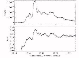 The 2003 November 2 flare observed by RHESSI occurred at W56 and was also associated with a GLE. The X-ray time history and hardness ratio are plotted in Figure 5. Once again there is no clear evidence for SHH spectral evolution.