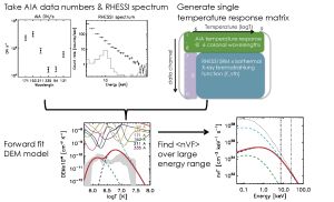 Figure 1: Illustration of the method of simultaneous RHESSI and AIA data fitting. In this case (see also ), two components (dark blue and green), one dominated by low-temperature emission from the corona and one dominated by flare emission