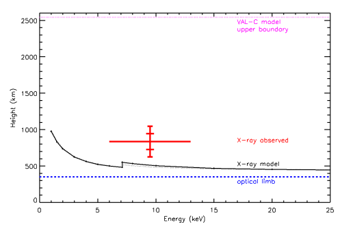- Why is the observed height somewhat above the expected modeled height? Is the VAL-C model simply not applicable for this case, noting that a flare is in progress, and would a more realistic model might fit better?