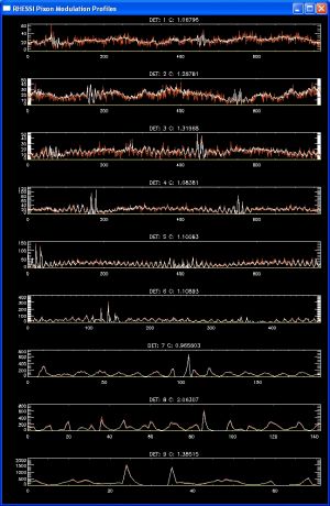 These pixon and Clean images show that there are two main sources with the north-east source appearing loop shaped. The pixon image shows an extended elliptical source surrounding the two main compact sources. The Pixon Modulation Profiles show that there are acceptable values of the C-statistic for all detectors except possibly for detector #8 where C = 2.06.