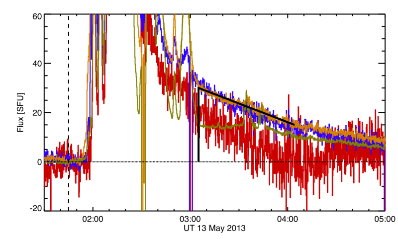 Light curves for 3.75, 9.4, 17, and 35 GHz from Nobeyama, for SOL2013-05-13T02. The heavy black line shows an estimate of the PBI component here.