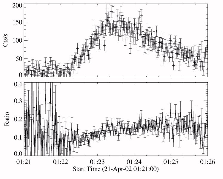 RHESSI 100-200 keV counting rate (top panel) and 100 – 200 keV/50 – 100 keV hardness ratio (bottom panel) for the second peak of the 2002 April 21 solar flare.