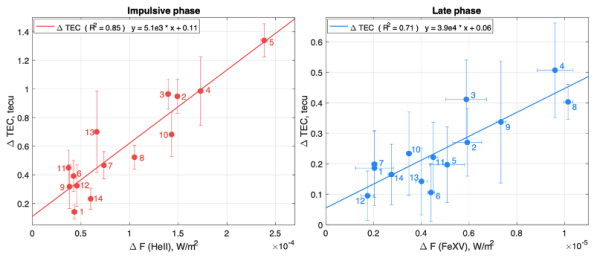 Figure 2 illustrates the empirical relationship between the increase in total electron content (TEC) during the impulsive (left) and late (right) phases, and the corresponding increase in flux in the He II 30.4 nm (F(He II)) and Fe XV 28.4 nm (F(Fe XV)) lines, respectively. The analysis is based on observations of 14 X-class flares.